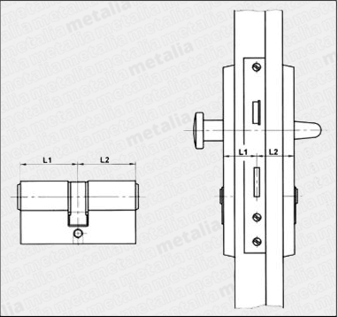 - odmeriame vzdialenosť medzi upevňovacou skrutkou cylindrickej vložky a vonkajšou hranou kovania z vonkajšej strany dverí (L1)